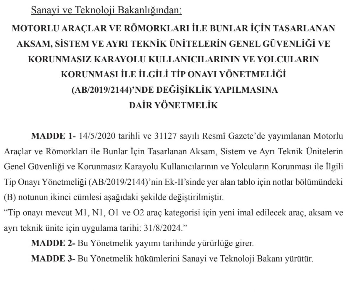 Sanayi ve Teknoloji Bakanlığı'nca hazırlanan "Motorlu Araçlar ve Römorkları ile Bunlar İçin Tasarlanan Aksam, Sistem ve Ayrı Teknik Ünitelerin Genel Güvenliği ve Korunmasız Karayolu Kullanıcılarının ve Yolcuların Korunması ile İlgili Tip Onayı Yönetmeliği'nde Değişiklik Yapılmasına Dair Yönetmelik", Resmi Gazete'de yayınlanarak yürürlüğe girdi.