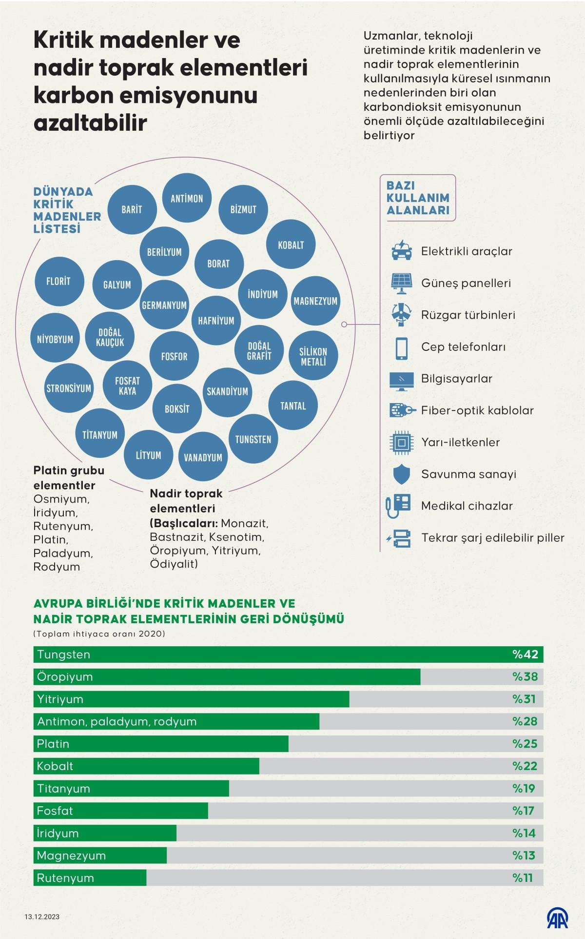 Avrupa Birliği (AB); televizyon, akıllı telefon, bilgisayar gibi teknolojik atıkları dönüştürerek kritik madenleri ve değerli elementleri geri kazanıyor. AB ülkeleri, 2020 yılında ihtiyaç duydukları tungstenin yüzde 42'sini, öropiyumun yüzde 38'ini, yitriyumun yüzde 31'ini, antimon, paladyum ve rodyumun yüzde 28'ini, platinin yüzde 25'ini, kobaltın yüzde 22'sini, titanyumun yüzde 19'unu, fosfatın yüzde 17'sini, iridyumun yüzde 14'ünü, magnezyumun yüzde 13'ünü, rutenyumun yüzde 11'ini, germanyum ve vanadyumun ise yüzde 2'sini geri dönüşümden kazandı.