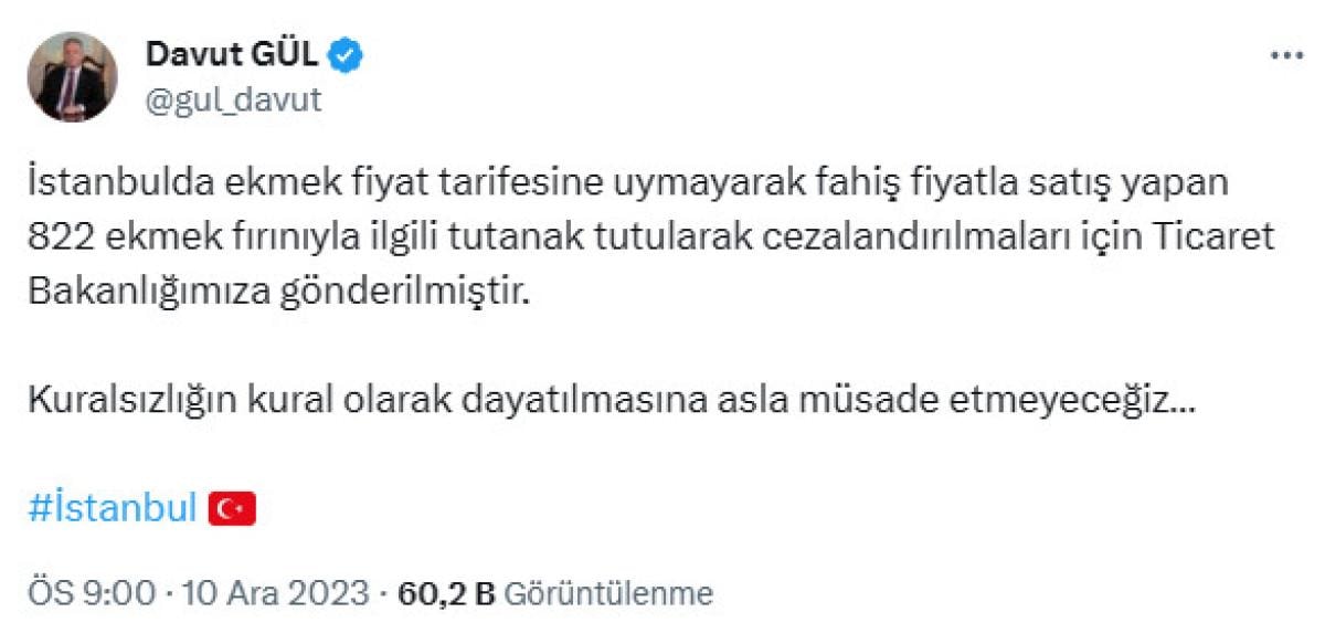 Sosyal medya hesabından açıklama yapan Vali Gül, İstanbul'da fahiş fiyatla ekmek satan 822 fırının tespit edilerek, hazırlanan tutanakların Ticaret Bakanlığı'na iletildiğini duyurdu: