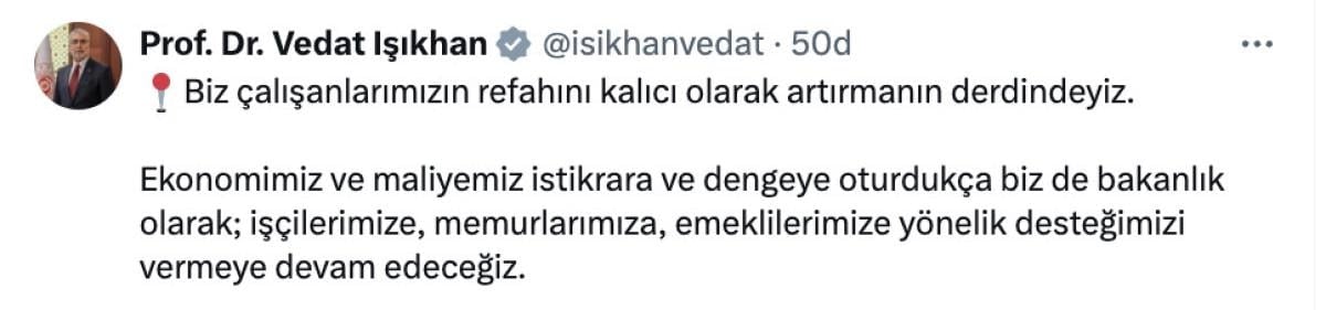 Bakan Işıkhan, sosyal medya hesabından bir mesaj paylaşarak "Biz çalışanlarımızın refahını kalıcı olarak artırmanın derdindeyiz. Ekonomimiz ve maliyemiz istikrara ve dengeye oturdukça biz de bakanlık olarak; işçilerimize, memurlarımıza, emeklilerimize yönelik desteğimizi vermeye devam edeceğiz." dedi.