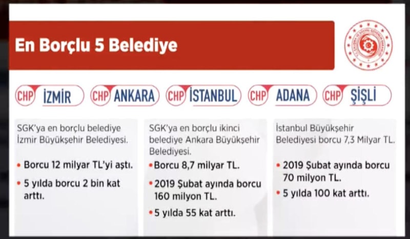 SGK’ya en borçlu belediye; İzmir Büyükşehir Belediyesi. Bu belediye yıllarca CHP’de. Borcu 12 milyar TL’yi aşmış durumda. 5 yılda borcunu 2 bin kat artırmış.