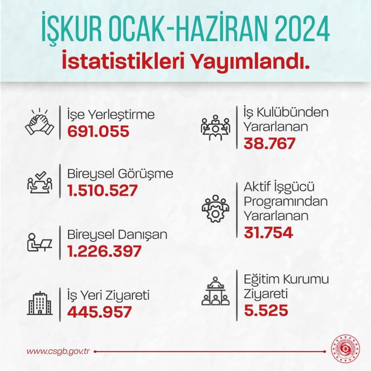Çalışma ve Sosyal Güvenlik Bakanı Vedat Işıkhan, İŞKUR’un hazırladığı ve 2024’ün ilk yarısında hizmetlerine ilişkin verileri içeren haziran ayı İstatistik Bülteni'ni yayınlandığını açıkladı.