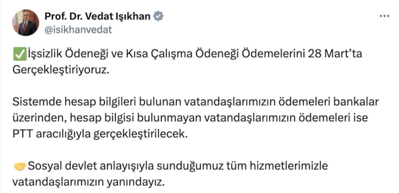 Çalışma ve Sosyal Güvenlik Bakanı Vedat Işıkhan, mart ayına ait işsizlik ve kısa çalışma ödeneğinin mart ayının son iş günü olan 28 Mart, Cuma günü gerçekleşeceğini bildirdi.
