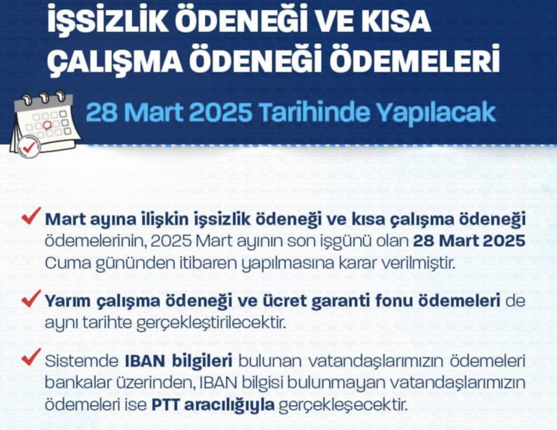 İşsizlik Ödeneği ve Kısa Çalışma Ödeneği ödemelerini 28 Mart’ta gerçekleştiriyoruz.