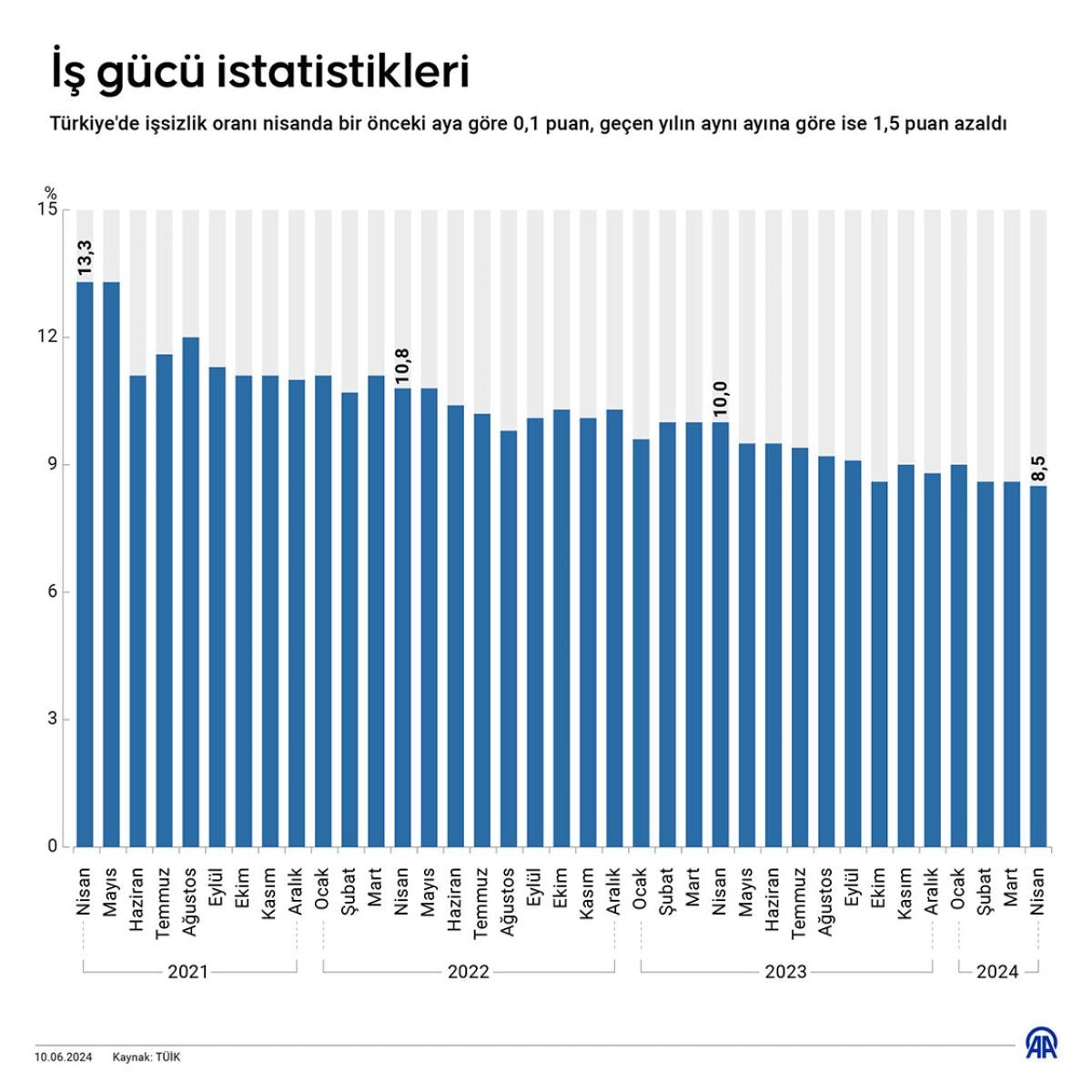 Işıkhan, son 12 aydır tekli hanelerde gerçekleşen işsizlik oranının, bir önceki aya göre 0,1 puan azalış ile yüzde 8,5 seviyesinde gerçekleştiğini belirterek, şu bilgileri verdi: