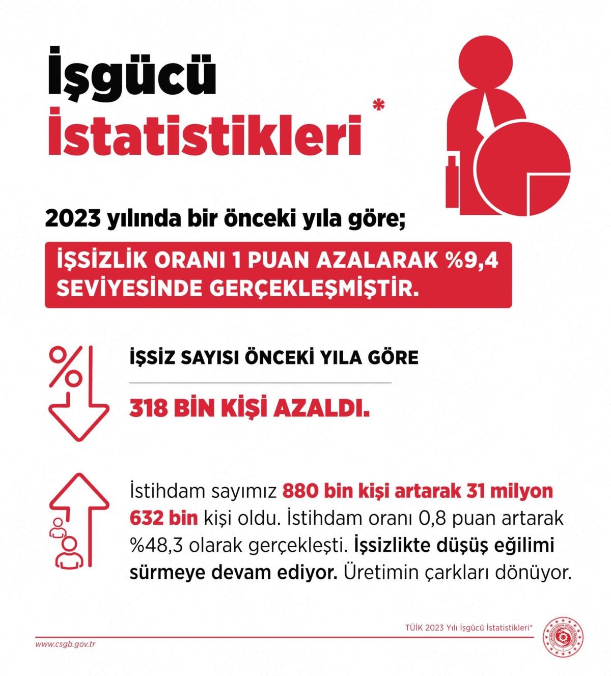 TÜİK tarafından açıklanan 2023 yılı İşgücü İstatistikleri ile işsizlik oranı, 2023 yılında bir önceki yıla göre 1 puan azalış göstererek yüzde 9,4'e geriledi.
