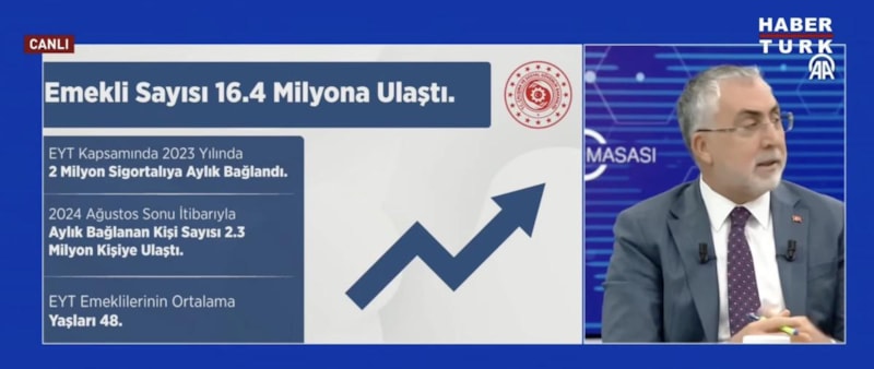 EYT’nin hangi süreçlerle gündeme geldiği herkesin malumu aslında. İş gücü piyasamıza da etkileri oldu, bütçeye etkileri oldu. Emekli sayımız 16,4 milyon. EYT’den faydalanan sigortalılar 2023 yılında 2 milyon sigortalıya aylık bağladık. 2024 Ağustos sonu itibarıyla aylık bağlanan kişi sayısı 2,3 milyon kişi. EYT emeklilerinin ortalama yaşı 48. 38 yaşında emekli olan vatandaşımız mevcut. Emekli olan 4A SSK’lıların yaklaşık yüzde 57’si tekrar çalışmaya devam ediyor. EYT emeklilerimizin ortalama aylıkları 17 bin TL’dir. EYT’nin maliyeti 2023 yılında yaşlılık aylığı, bayram ikramiyesi, toplamı yaklaşık 210 milyar TL. 42,1 milyar TL prim kaybımız var. 2,5 milyona yakın vatandaşımız EYT ile emeklilik hakkı kazanmasına rağmen sistemimize başvurmamış, sistemde kalıp üretmeye devam ediyorlar.