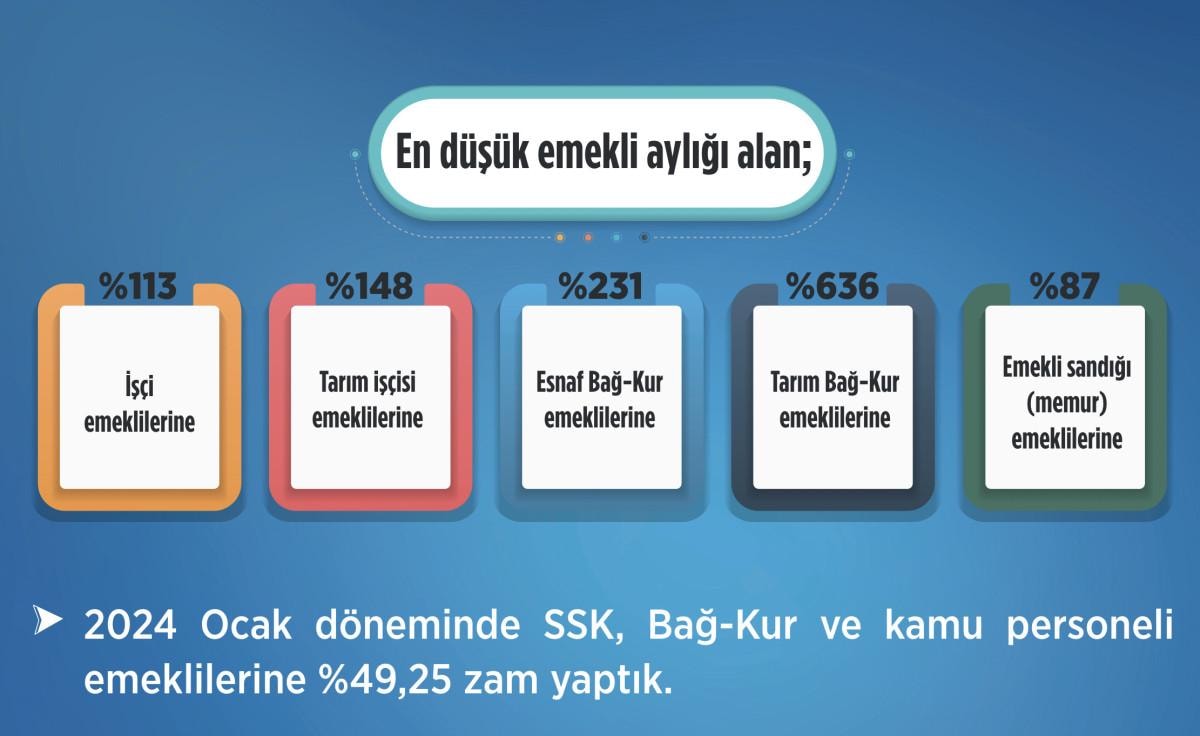2024 Ocak döneminde SSK, Bağ-Kur ve memur emeklilerine ayrım yapılmadan eşit biçimde yüzde 49,25 oranında zam yaptık. Emeklilerimizin, emeklilik dönemini en iyi koşullarda geçirmelerini sağlamanın, bunun için de, gelir-gider dengesinin korunduğu; sürdürülebilir bir Sosyal Güvenlik Sistemini inşa etmenin en temel vazifemiz olduğunu biliyoruz.