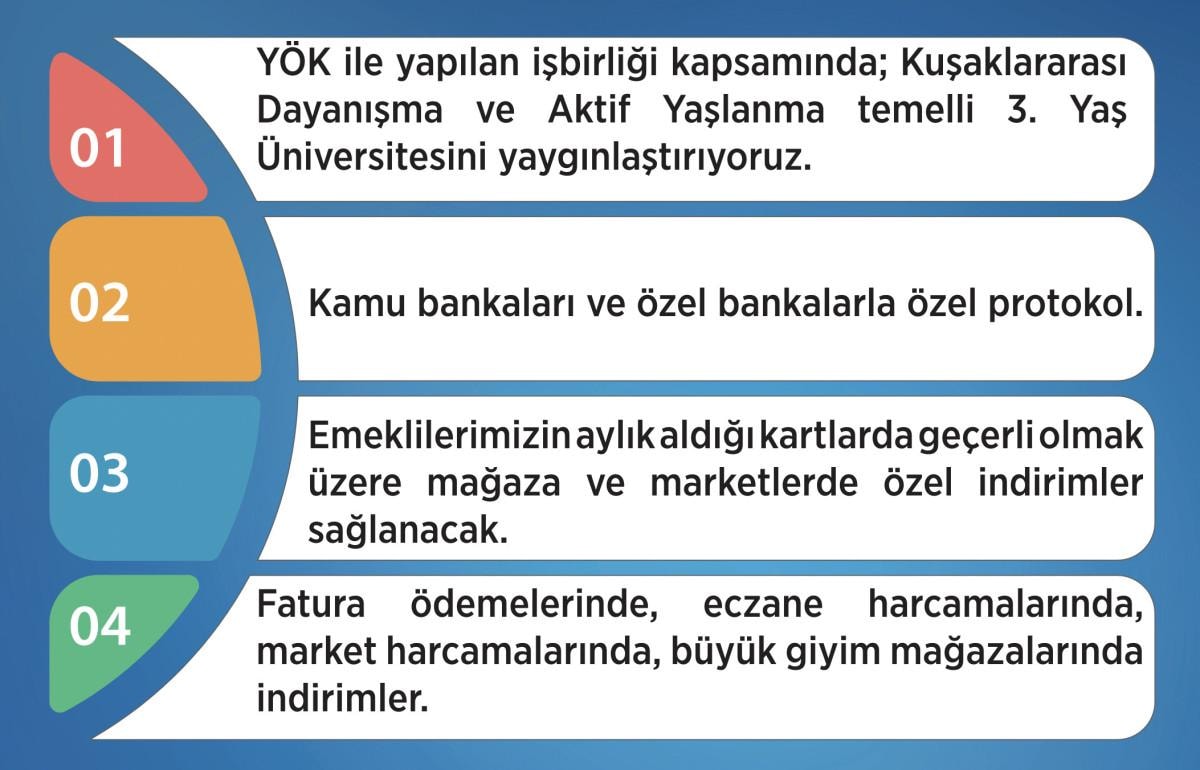 * Ayrıca yine haberleşme, ulaşım, kültürel faaliyetlerden; zincir marketlere, online pazar yerlerine kadar bir çok anlaşmayı emeklilerimiz için hayata geçireceğiz.