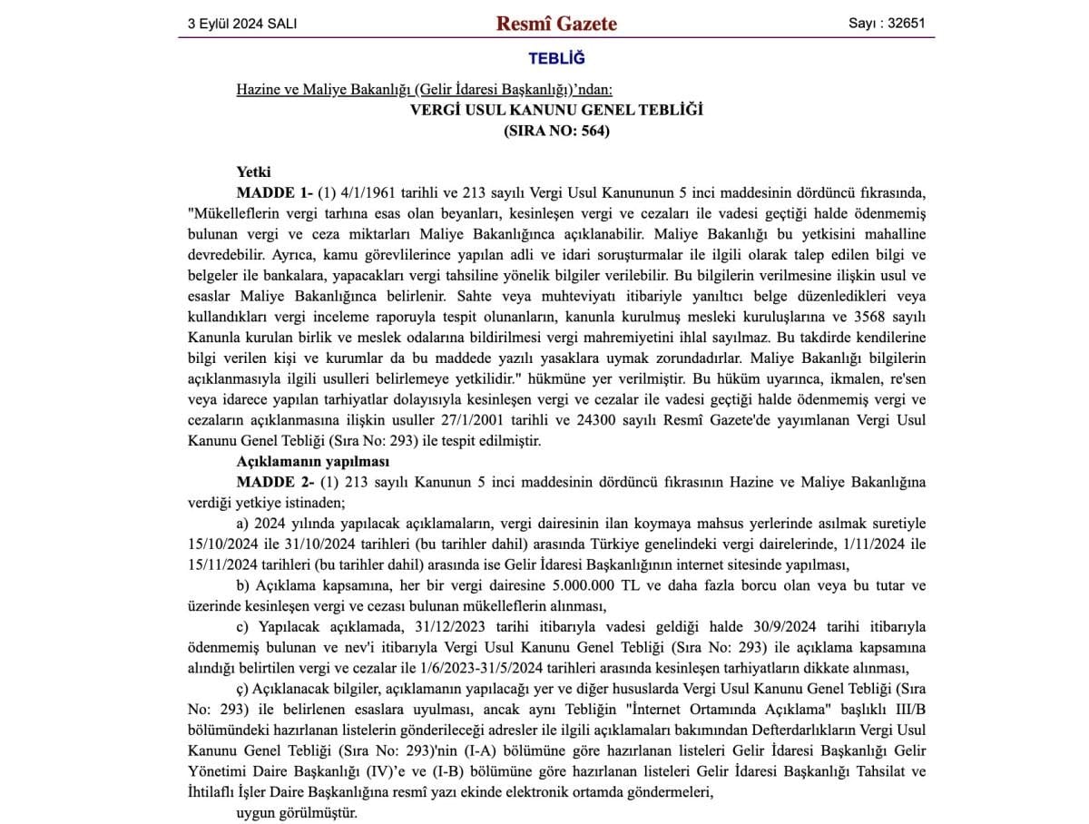Yapılacak açıklamada, 31 Aralık 2023 tarihi itibarıyla vadesi geldiği halde 30 Eylül 2024 tarihi itibarıyla ödenmemiş bulunan ve nev'i itibarıyla Vergi Usul Kanunu Genel Tebliği ile açıklama kapsamına alındığı belirtilen vergi ve cezalar ile 1/ Haziran 2023-31 mayıs 2024 tarihleri arasında kesinleşen tarhiyatların dikkate alınması...