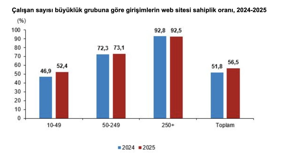 - TÜİK 2025 yılına ait Bilişim Teknolojileri Kullanım Araştırması sonuçlarına göre, en az 10 çalışanı olan girişimlerin web sitesi sahiplik oranı yüzde 56,5'e ulaştı.