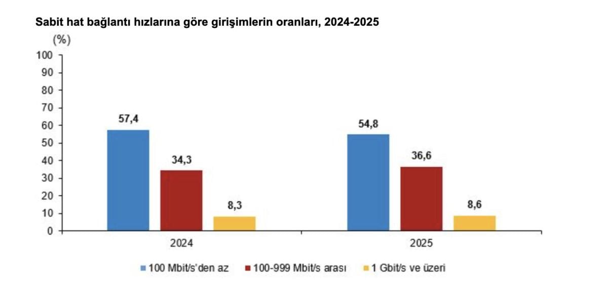 En az 10 ve daha fazla çalışanı olan girişimlerin yüzde 93,6'sı 2025 yılında İnternete erişimde sabit hat İnternet bağlantısı kullandı. Sabit hat İnternet bağlantısı kullanan girişimlerin abone oldukları en yüksek bağlantı hızları incelendiğinde; 2025 yılında girişimlerin yüzde 54,8'inin 100 Mbit/s'den az hızda, yüzde 36,6'sının 100-999 Mbit/s hız aralığında ve yüzde 8,6'sının 1 Gbit/s ve üzeri hızda İnternet kullandığı görüldü.