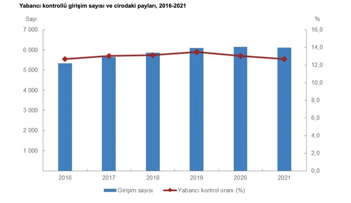 Buna göre yabancı kontrollü girişim istatistiklerine göre, yabancı kontrolündeki girişim sayısı 2020 yılında 6 bin 154 ve 2021 yılında 6 bin 111 oldu.