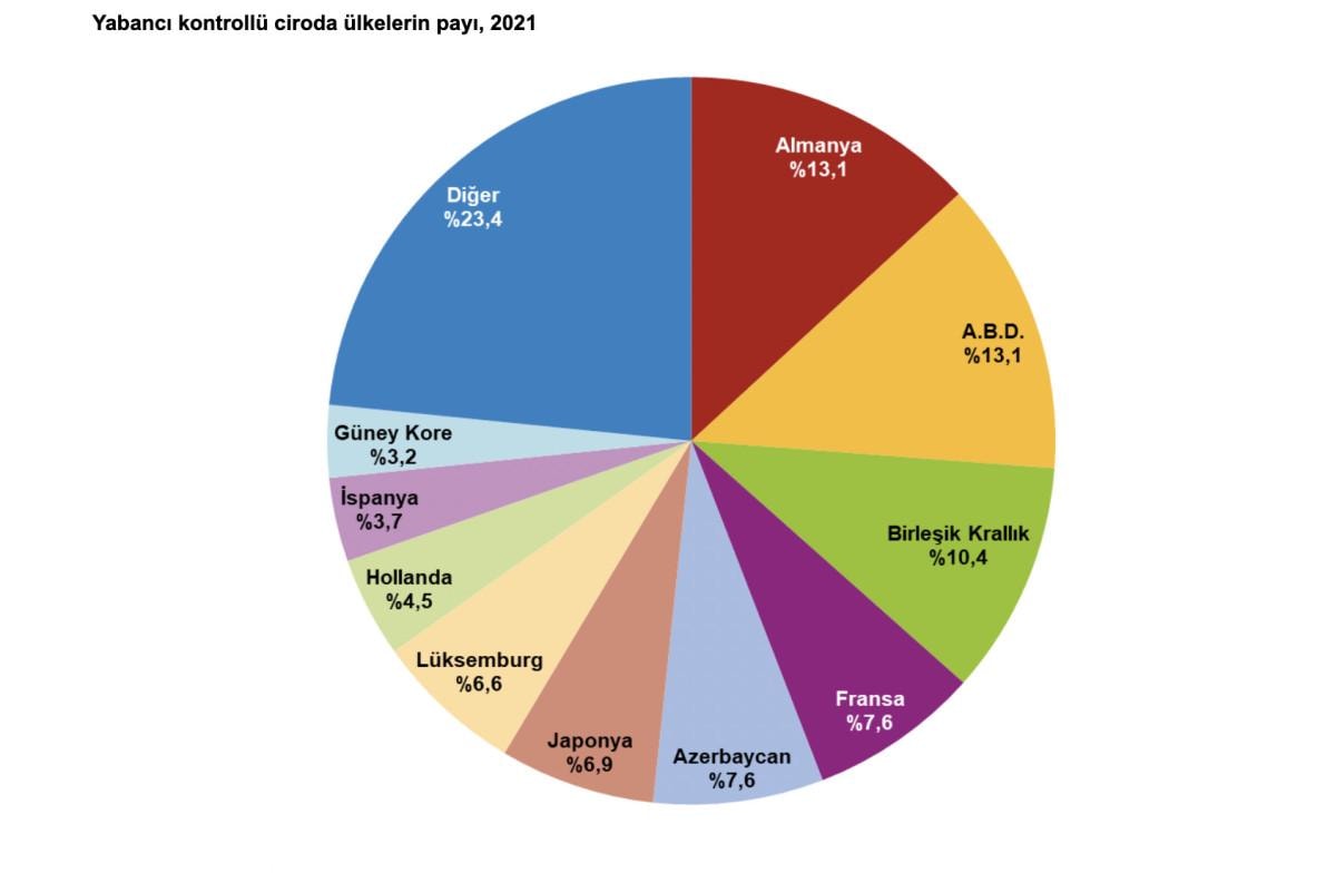 Yabancı kontrollü 6 111 girişimden 1 025 tanesi Almanya tarafından kontrol edildi. Almanya tarafından kontrol edilen girişimlerin 2021 yılında elde ettiği cironun toplam yabancı kontrollü cirodaki payı yüzde 13,1 oldu. ABD kontrolündeki 698 girişimin toplam yabancı kontrollü cirodaki payı ise yüzde 13,1 olarak gerçekleşti.