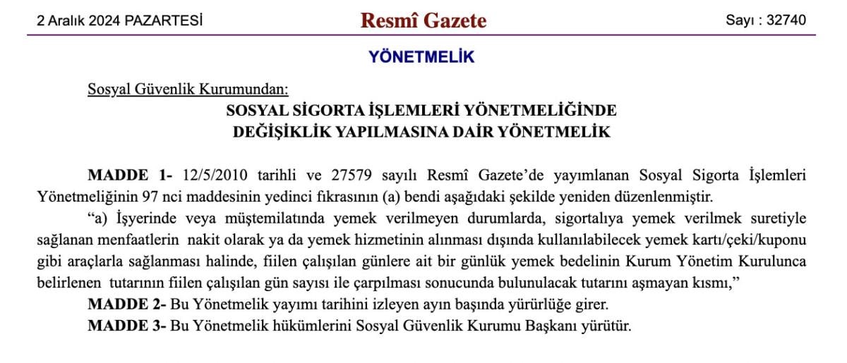 Yayımlanan Sosyal Sigorta İşlemleri Yönetmeliğinde yapılan değişiklikle yemek verilmeyen işyerlerinde yemek bedeli ödemelerine yemek kartları ve çekleri de dahil edildi.