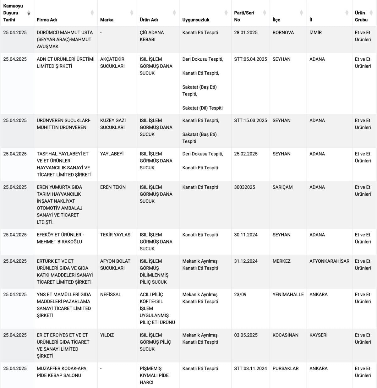 İhlaller et ve et ürünlerinde yaşandı.