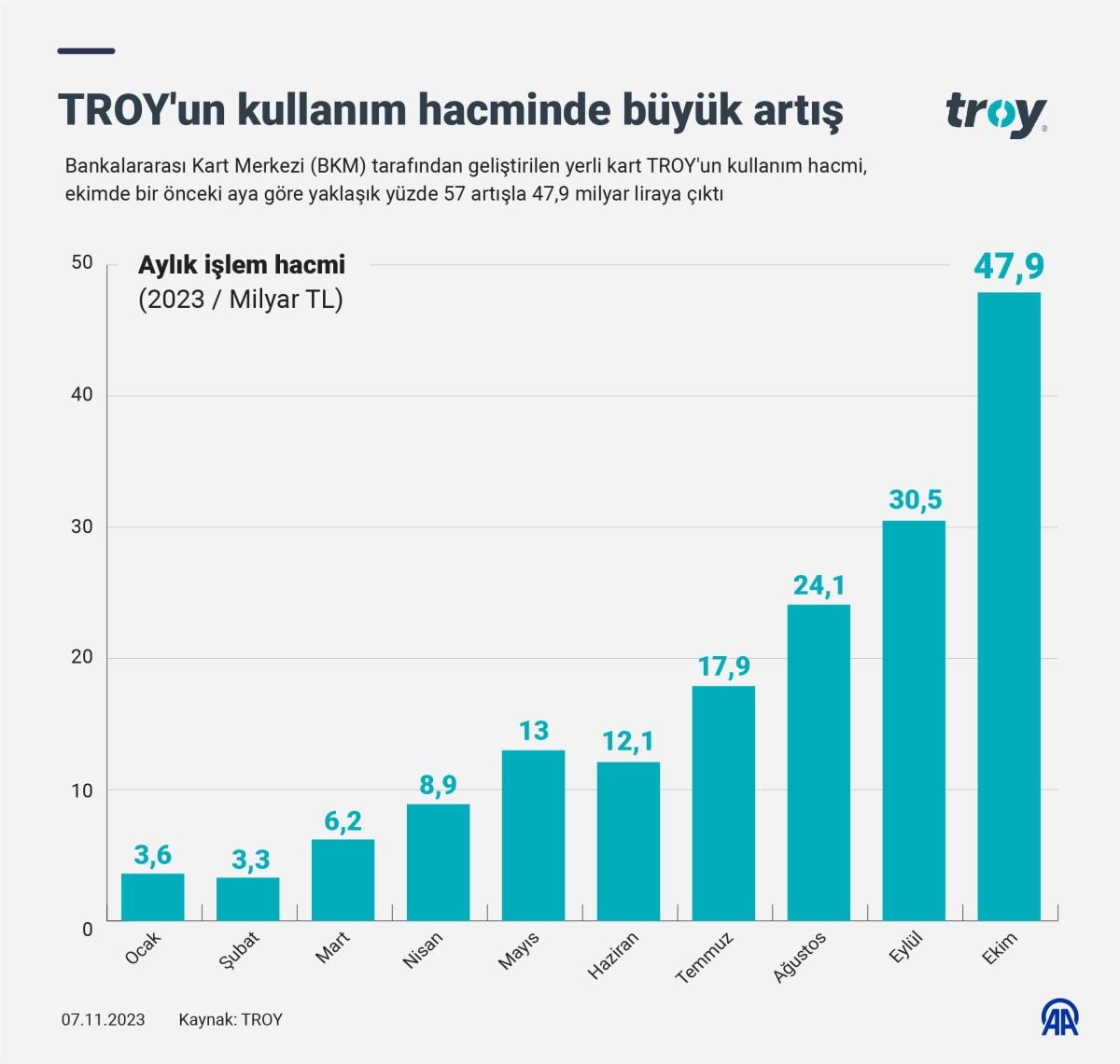 TROY logolu kartlar ile gerçekleşen alışveriş hacmi bu yıl ekimde, ocak ayına göre yaklaşık 14 kat artarak 48 milyar lira seviyesine yükselirken, 2023 başından itibaren TROY kartlar ile toplam 239,2 milyar liralık işlem yapıldı.