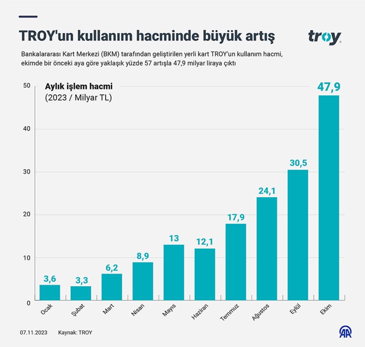 Bankalararası Kart Merkezi (BKM) tarafından geliştirilen yerli kart TROY'un kullanım hacmi, ekimde bir önceki aya göre yaklaşık yüzde 57 artışla 30,5 milyar liradan 47,9 milyar liraya çıktı.