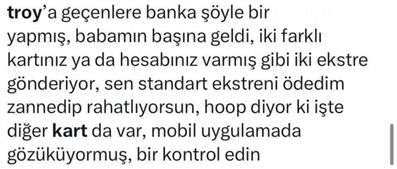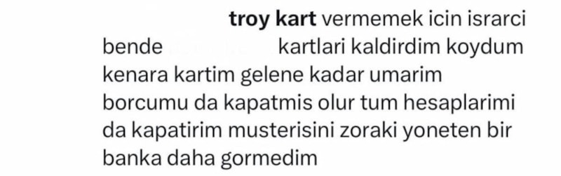 Kimi kullanıcı yorumlarında ise, bankaların mevcut ödeme altyapısını iptal etmeden ikinci bir kart olarak TROY ödeme sistemli kartı gönderdiği ve bu iki kart için ek ücret talep ettiği belirtildi.