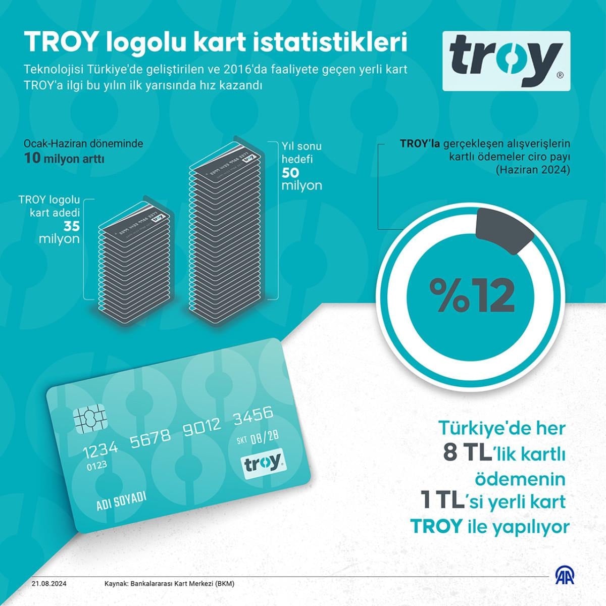 Teknolojisi Türkiye'de geliştirilen yerli kart TROY, ilk yarıda 10 milyonluk artışla 35 milyona ulaşırken, yıl sonunda TROY logolu kart sayısının 50 milyona çıkması hedefleniyor.