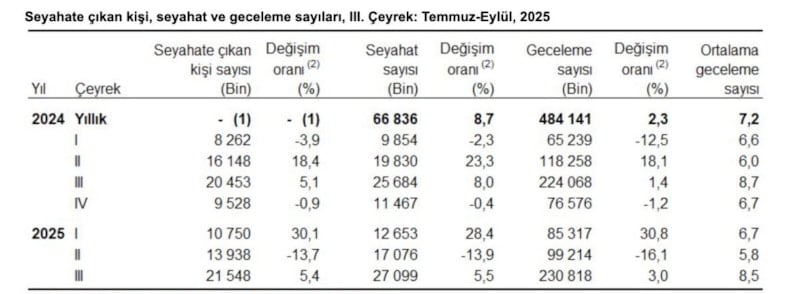 Bu kapsamda yerli turistlerin seyahat sayısı Ocak-Eylül 2025 döneminde bir önceki yılın aynı dönemine kıyasla yüzde 2,6 artışla 56 milyon 828 bin olarak kayıtlara geçti.