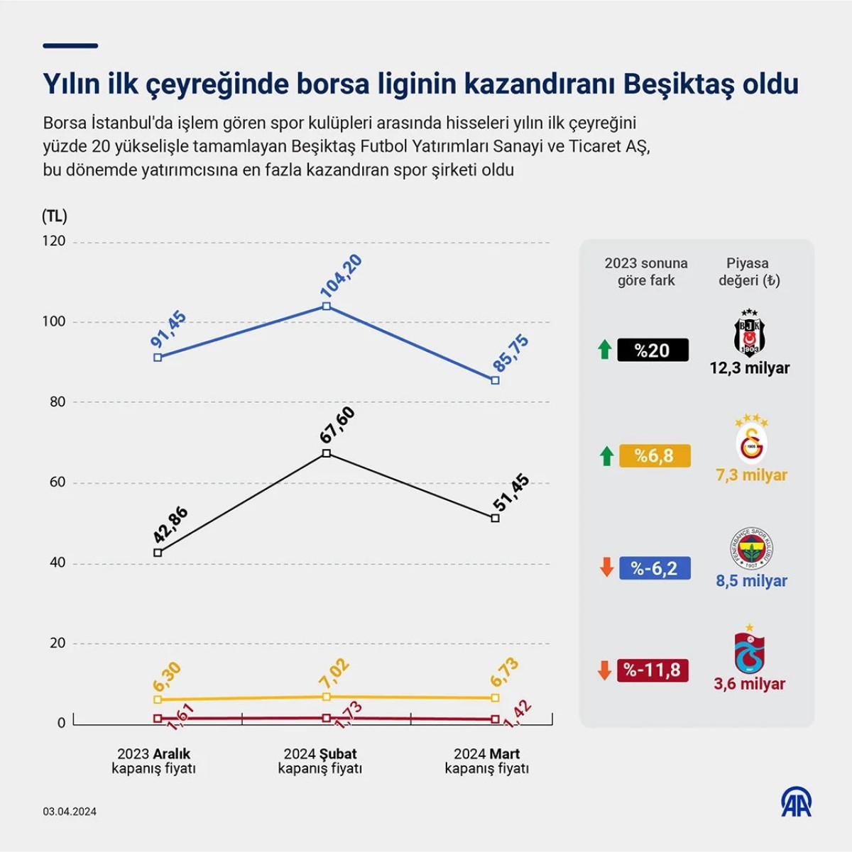 Tüm bu gelişmelerin ışığında Borsa İstanbul'da işlem gören spor kulüpleri arasında ilk çeyrekte yatırımcısına en fazla kazandıran spor şirketi hisseleri, yüzde 20 yükselen Beşiktaş Futbol Yatırımları Sanayi ve Ticaret AŞ oldu.