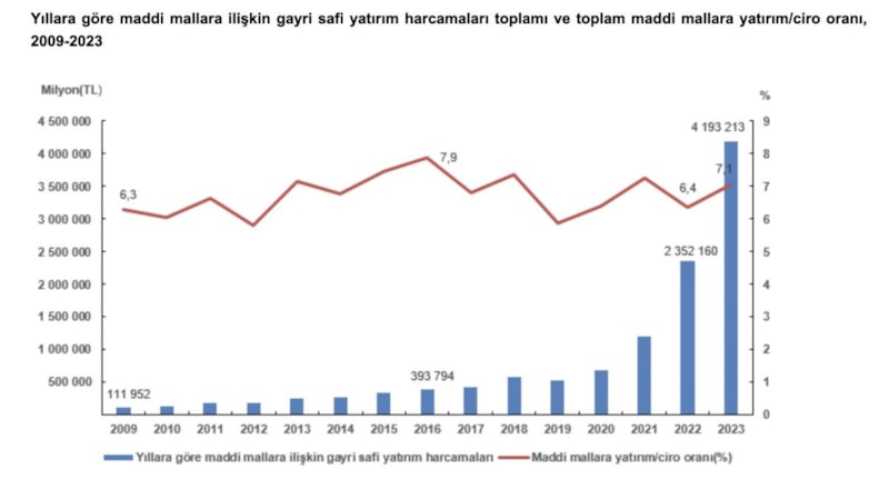 Buna göre, Türkiye'de 2023'te maddi mallara 4,2 trilyon liralık yatırım gerçekleştirildi.