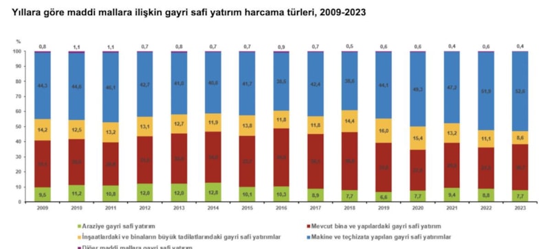 2023 yılında maddi mallara ilişkin gayri safi yatırım harcamalarının 2 trilyon 206 milyar TL'si makine ve teçhizata, 1 trilyon 287 milyar TL'si mevcut bina ve yapılara, 361 milyar TL'si inşaatlardaki ve binaların büyük tadilatlarına, 323 milyar TL'si araziye ve 17 milyar TL'si diğer maddi mallara yatırım harcamaları olarak gerçekleşti.