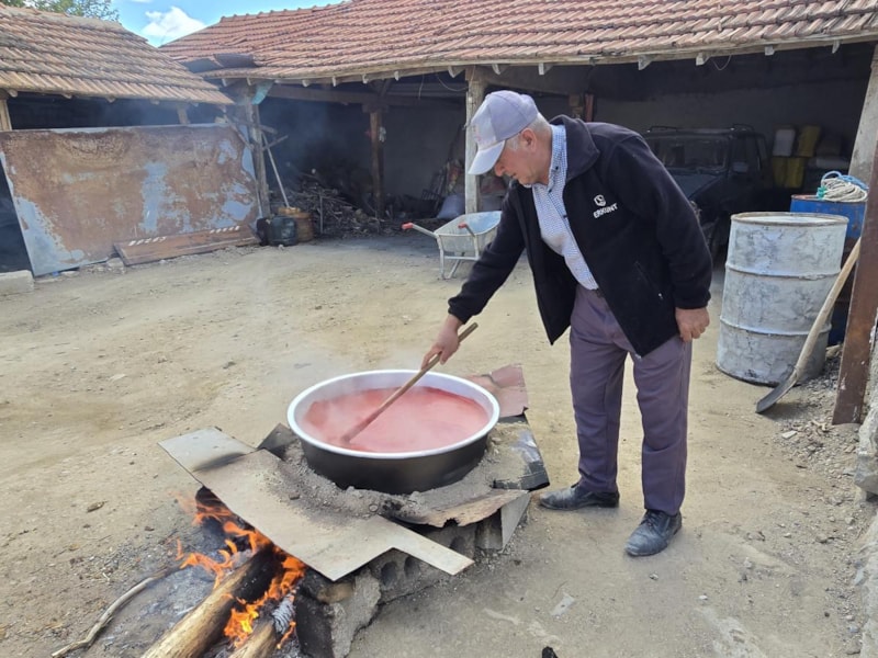 Elekten geçirilerek kabuğu ve sıvı kısmı ayrılan domatesler büyük kazanlarda odun ve tezek ateşinde kaynayarak ağır ağır pişiyor.