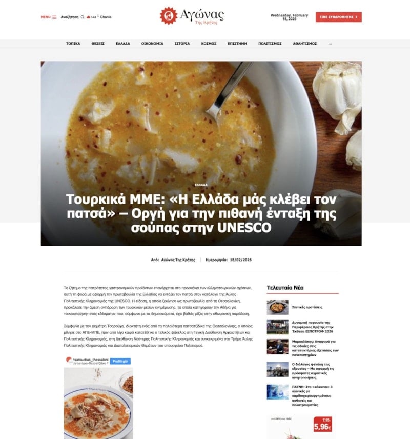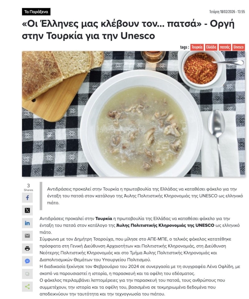 Yunan medyası, Yunanistan’ın işkembe çorbasını sahiplenmesi haberlerine itiraz eden Türk medyasını sayfalarına taşıyarak, "UNESCO’ya karşı Türkiye’de öfke. Çorbanın UNESCO listesine dahil edilme olasılığına tepki. Türk medyası: İşkembe üzerine mutfak savaşı. ‘Yunanlılar asla bizim mutfağımızın ana yemeğini elimizden alamaz." manşetlerini attı.