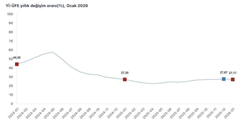 Yurt İçi Üretici Fiyat Endeksi (Yİ-ÜFE) 2026 yılı Ocak ayında, bir önceki aya göre yüzde 2,67 artış, bir önceki yılın Aralık ayına göre yüzde 2,67 artış, bir önceki yılın aynı ayına göre yüzde 27,17 artış ve on iki aylık ortalamalara göre yüzde 25,39 artış gösterdi.
