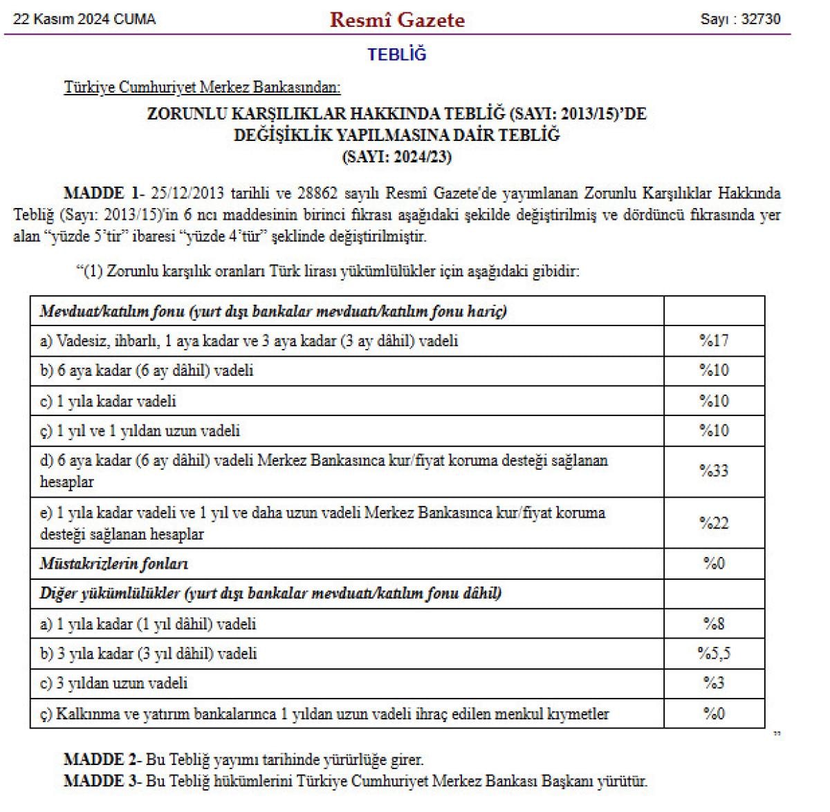 TL mevduat hesaplarına uygulanan zorunlu karşılık oranları ile yabancı para (YP) mevduat için TL cinsinden tesis edilmesi gereken zorunlu karşılık oranı değiştirildi.