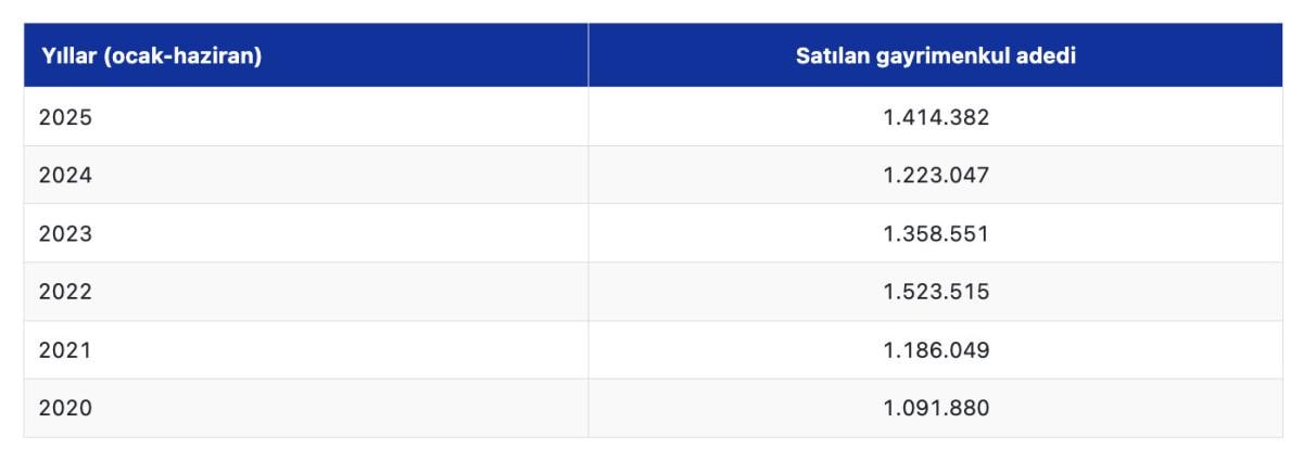 2020-2025 yılları ocak-haziran dönemleri dikkate alındığında ülke genelinde satılan gayrimenkul adetleri şu şekilde: