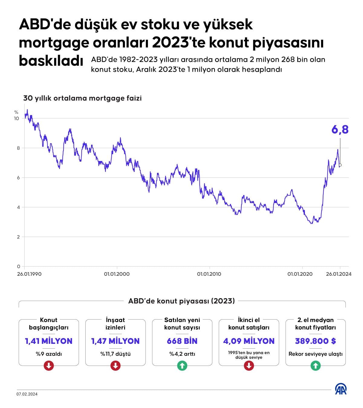 Geçen yıl boyunca yüksek faiz oranları konut talebini baskılarken, 2023'ün son aylarında düşmeye başlayan 30 yıllık mortgage oranları yüzde 6,7 civarında dengelendi.