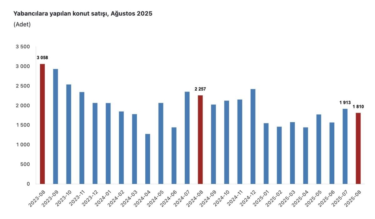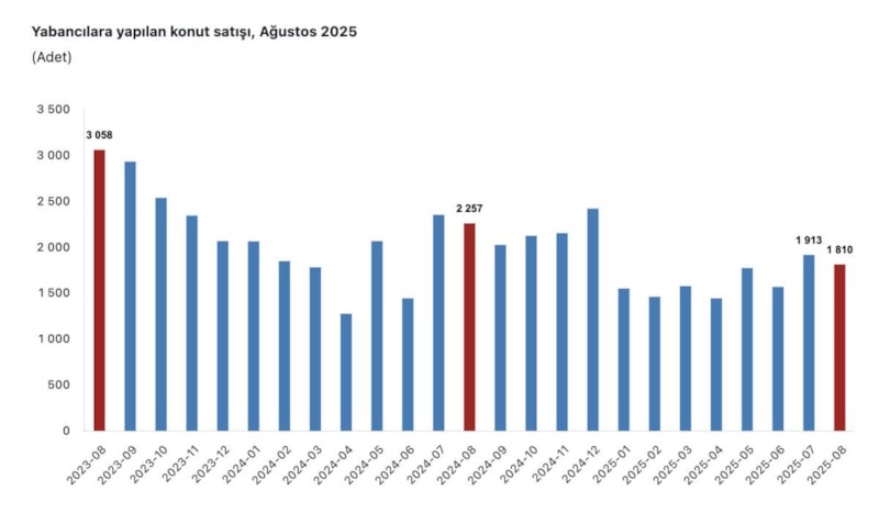 Ağustosta yabancılara yapılan konut satışları ağustosta, yıllık bazda yüzde 19,8 azaldı.