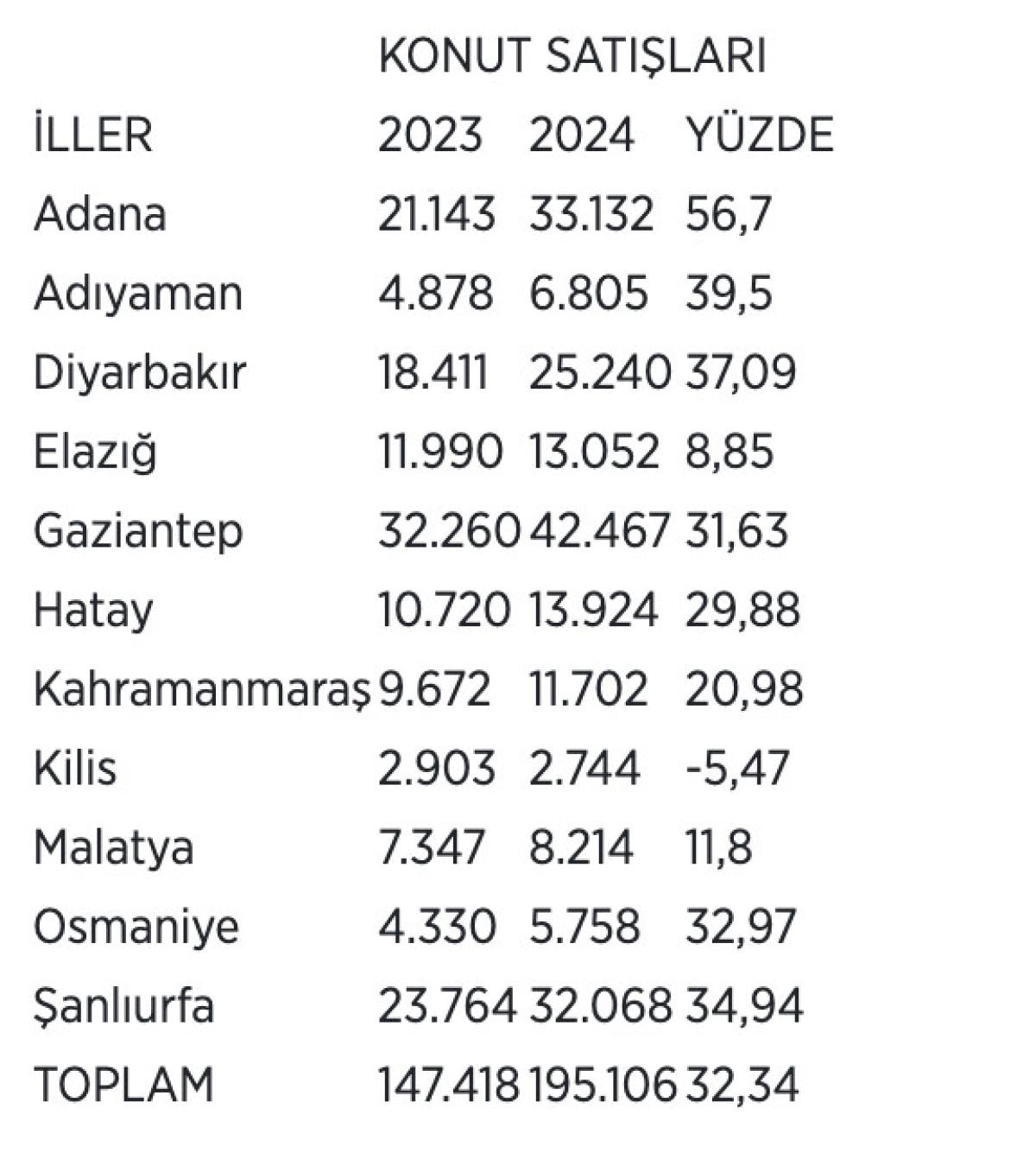 Depremin etkilediği 11 ilde en fazla konut satışı ise Gaziantep'te gerçekleşti. Geçen yıl bu ilde 42 bin 467 konut satılırken bir önceki yıla göre artış oranı yüzde 31,63 olarak kayıtlara geçti.