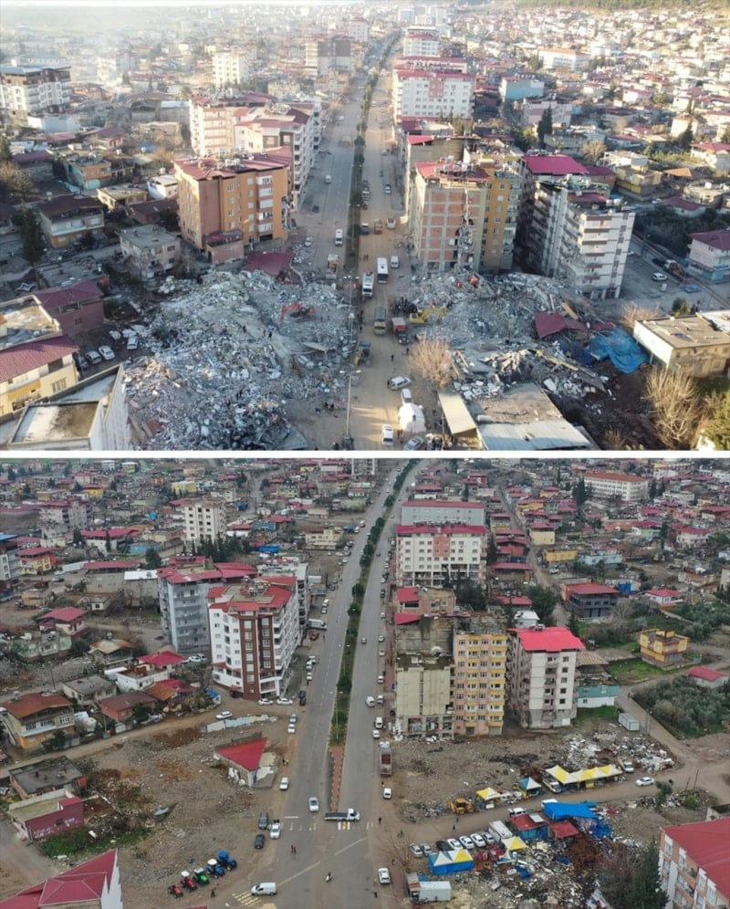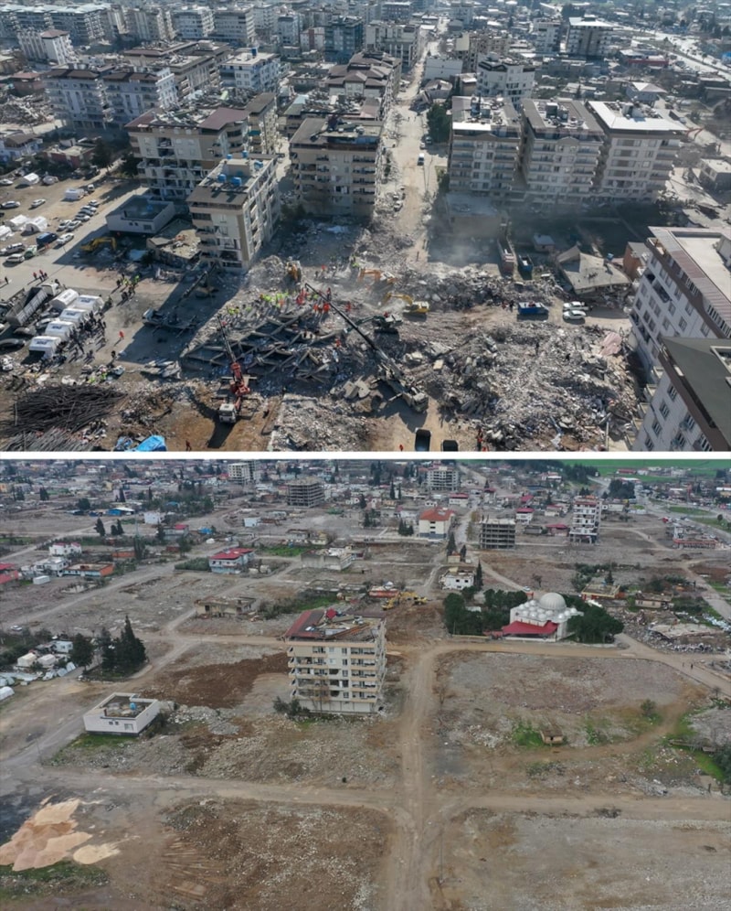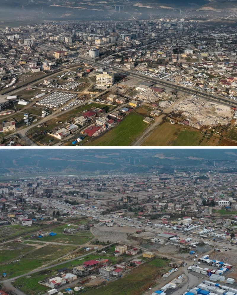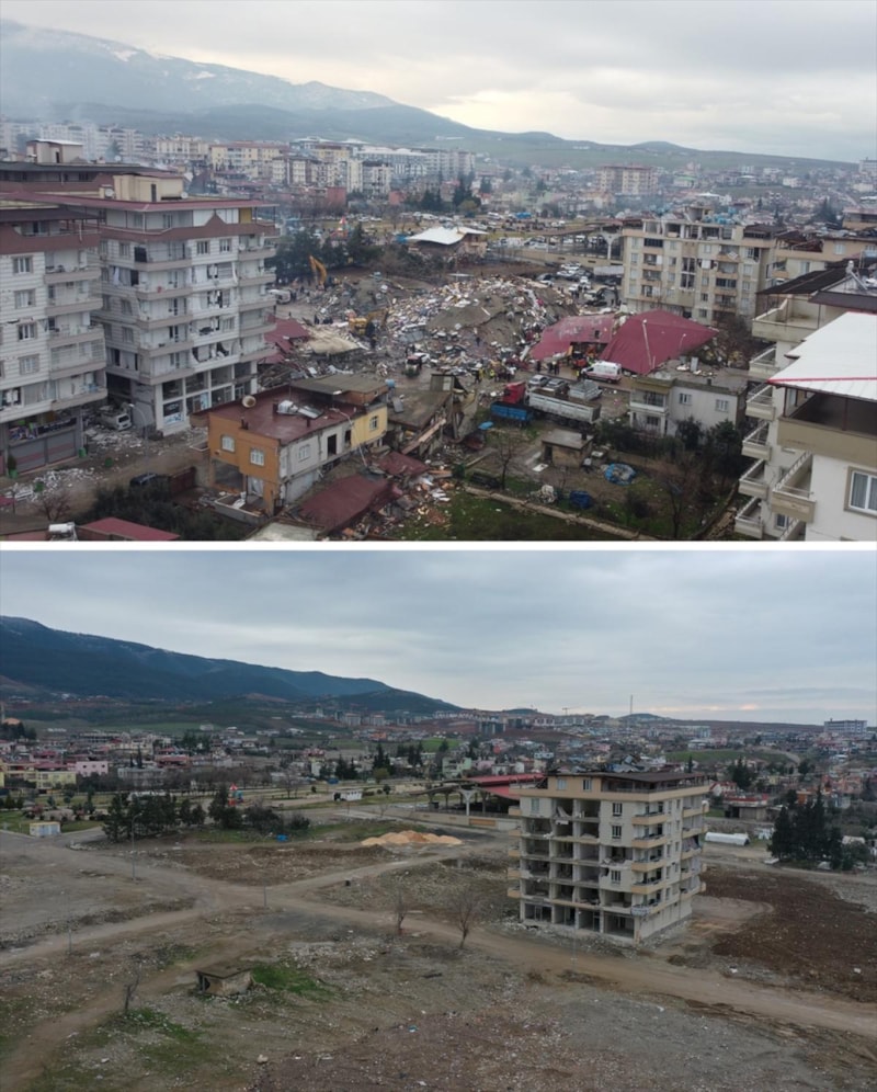 Nurdağı'nda 6 Şubat'ta çekilen görüntüler ile enkaz kaldırma çalışmalarının ardından kaydedilen görüntüler karşılaştırıldığında ilçe merkezlerindeki büyük boş alanlar dikkati çekiyor.