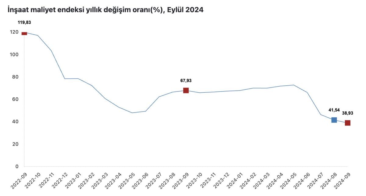 Buna göre inşaat maliyet endeksi 2024 yılı Eylül ayında, bir önceki aya göre yüzde 0,57 ve bir önceki yılın aynı ayına göre yüzde 38,93 arttı.