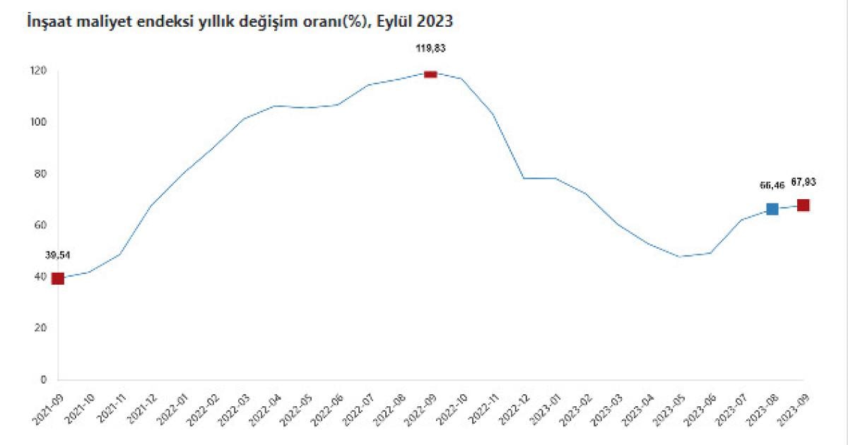 İnşaat maliyet endeksi 2023 yılı Eylül ayında, bir önceki aya göre yüzde 2,46 arttı, bir önceki yılın aynı ayına göre yüzde 67,93 arttı. Bir önceki aya göre malzeme endeksi yüzde 3,39 arttı, işçilik endeksi yüzde 0,30 arttı. Ayrıca bir önceki yılın aynı ayına göre malzeme endeksi yüzde 54,15 arttı, işçilik endeksi yüzde 114,05 arttı.