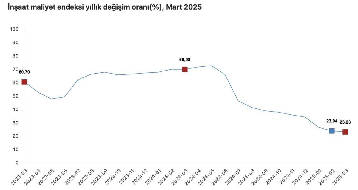 Bina inşaatı maliyet endeksi martta, bir önceki aya göre yüzde 1,45, geçen yılın aynı ayına kıyasla yüzde 23,6 yükseliş kaydetti.