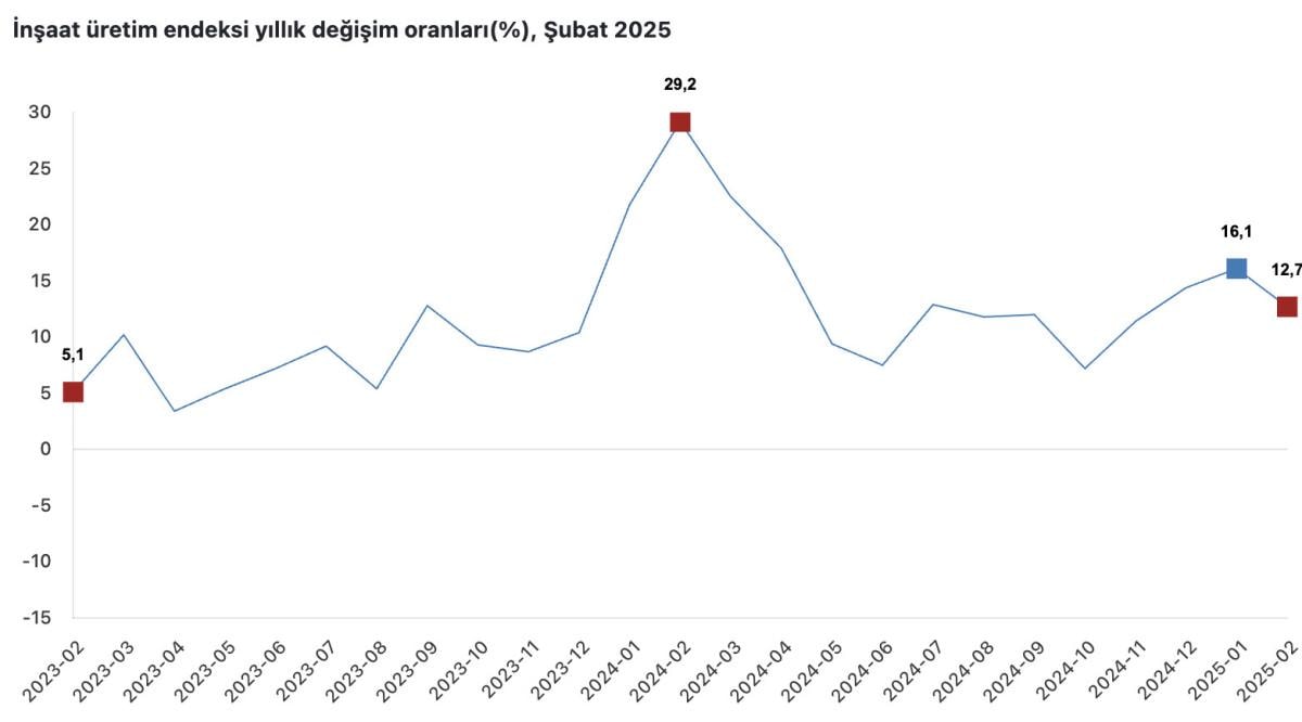 Türkiye İstatistik Kurumu'nun (TÜİK) inşaatın alt sektörleri incelendiğinde, 2025 yılı Şubat ayında bina inşaatı sektörü endeksi, bir önceki yılın aynı ayına göre yüzde 14,9 arttı.