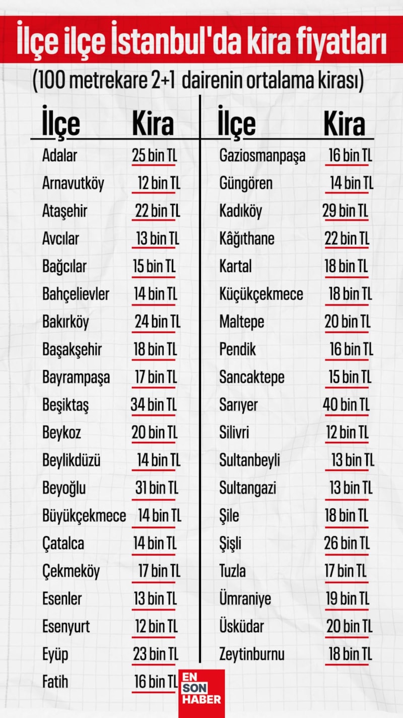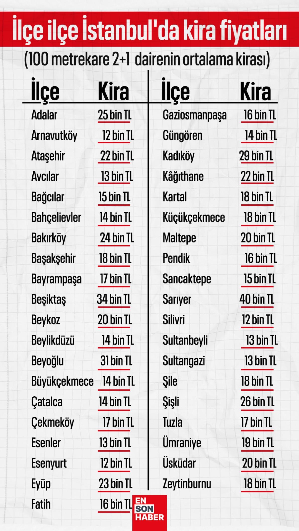 En düşük kiranın ise 12 bin TL ile Arnavutköy, Esenyurt ve Silivri ilçesinde olduğu görüldü.