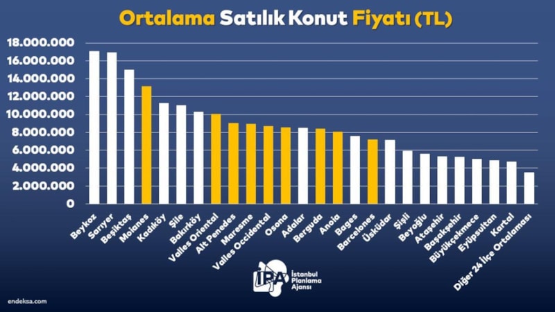 Yayınlanan grafiklere göre İstanbul'da en yüksek konut fiyatı 17 milyon TL ile Beykoz'da en düşük konut bedeli ise 4 milyon 700 bin ile Kartal'da tespit edildi.