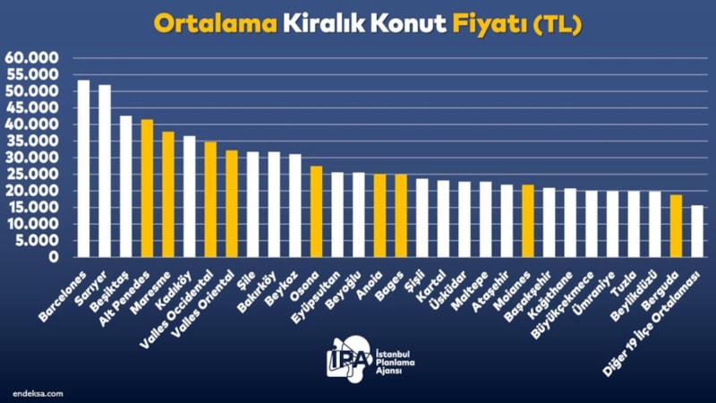 Grafiklere göre İstanbul'da en yüksek konut kirası 51 bin TL ile Sarıyer'de ve en düşük konut kirası ise 20 bin 700 TL ile ile Kağıthane'de tespit edildi.