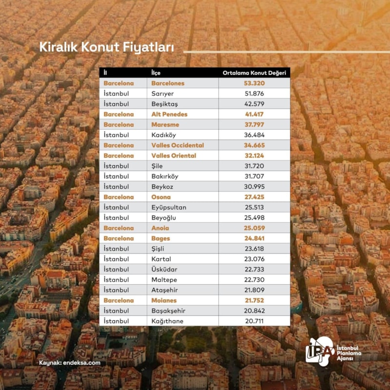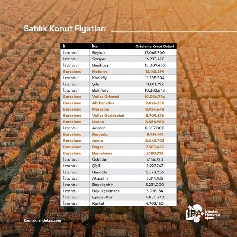 İstanbul Büyükşehir Belediyesi’ne (İBB) bağlı İstanbul Planlama Ajansı (İPA) Başkanı Buğra Gökce, İstanbul’daki satılık konut fiyatlarıyla Barcelona'yı karşılaştırarak sosyal medya hesabından çarpıcı verileri paylaştı.