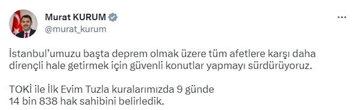 Konuya ilişkin Murat Kurum'dan yeni bir paylaşım daha geldi. Bakan Kurum, sosyal medya hesabından şu ifadeleri kullandı: