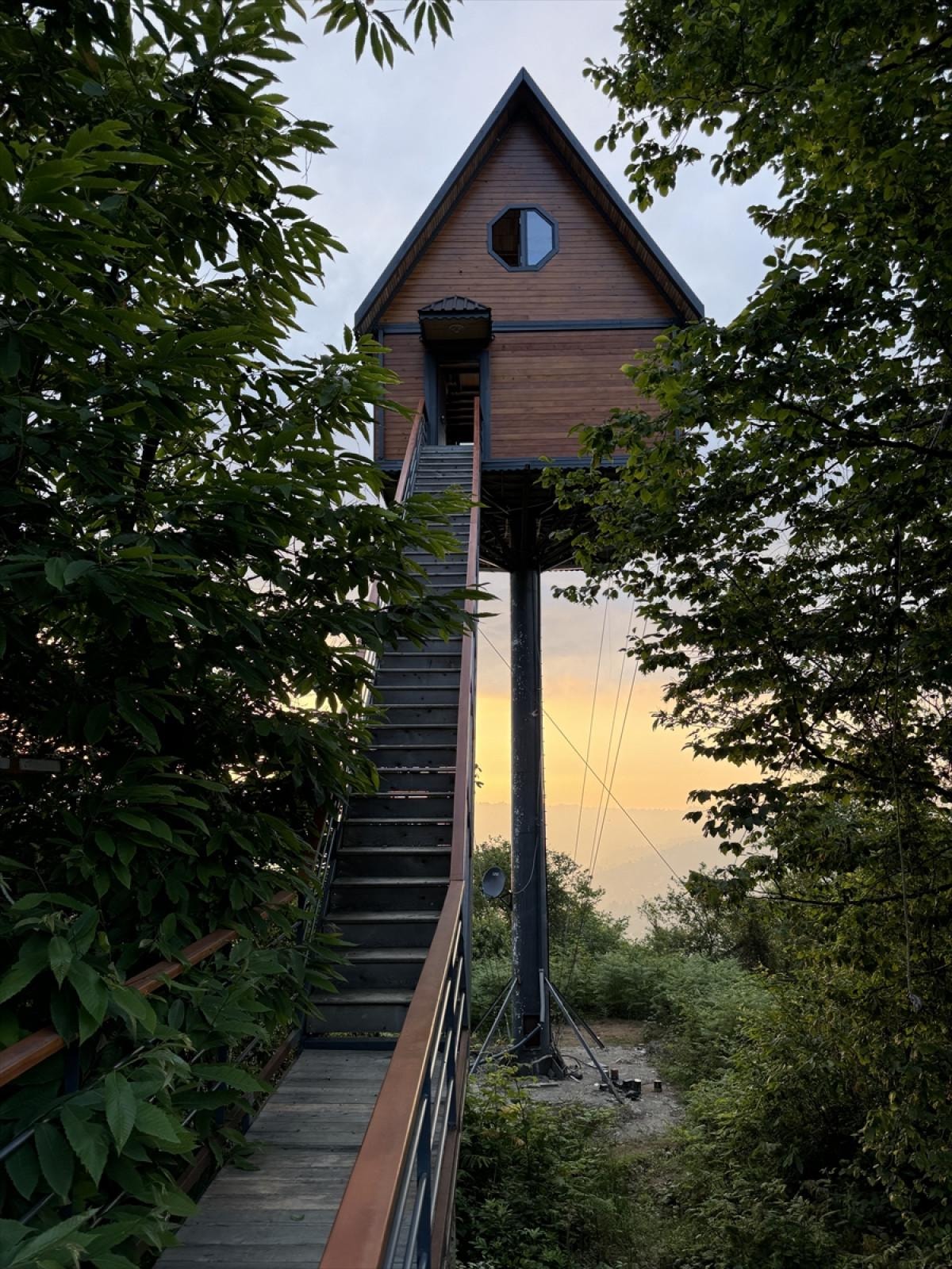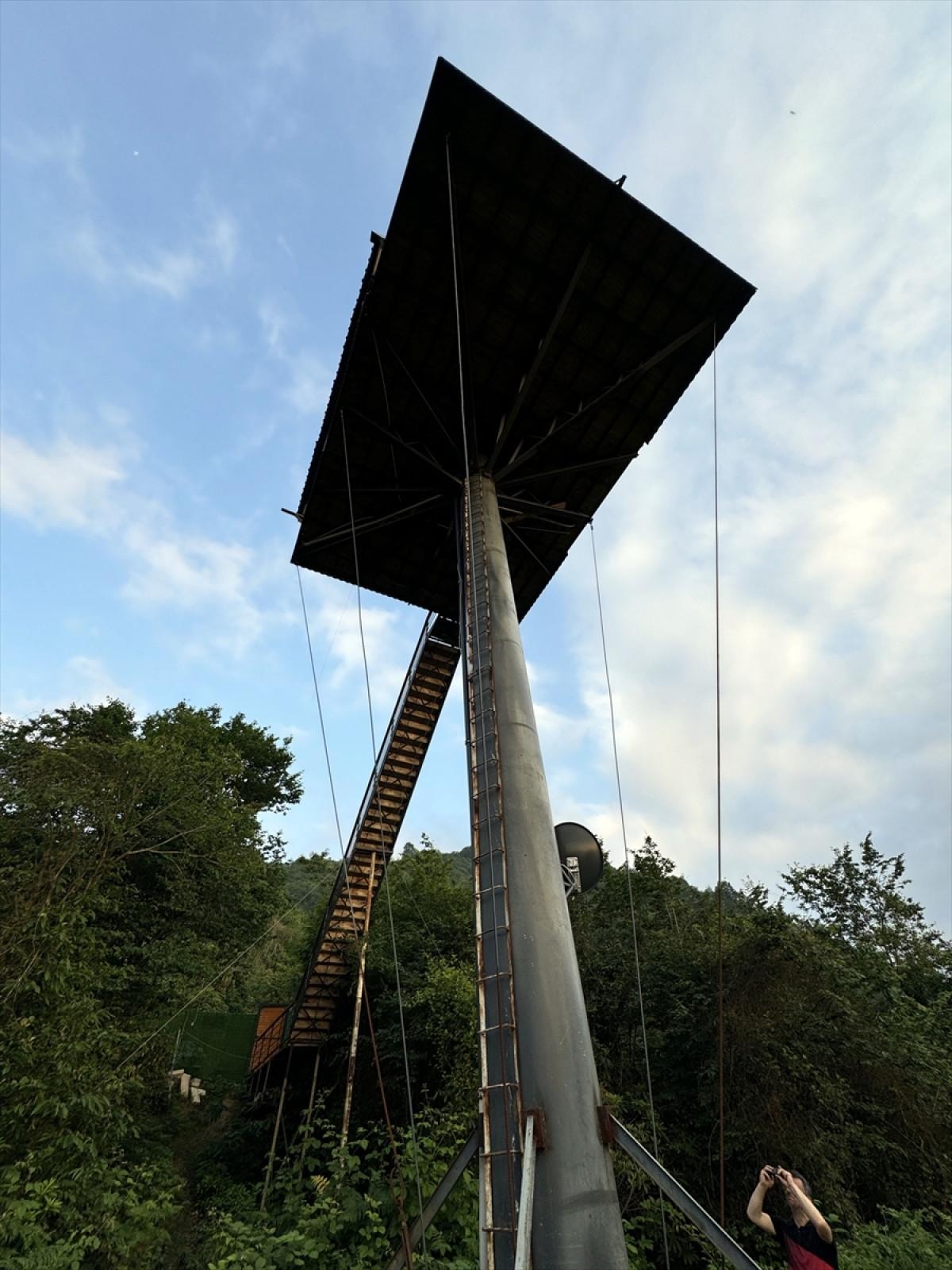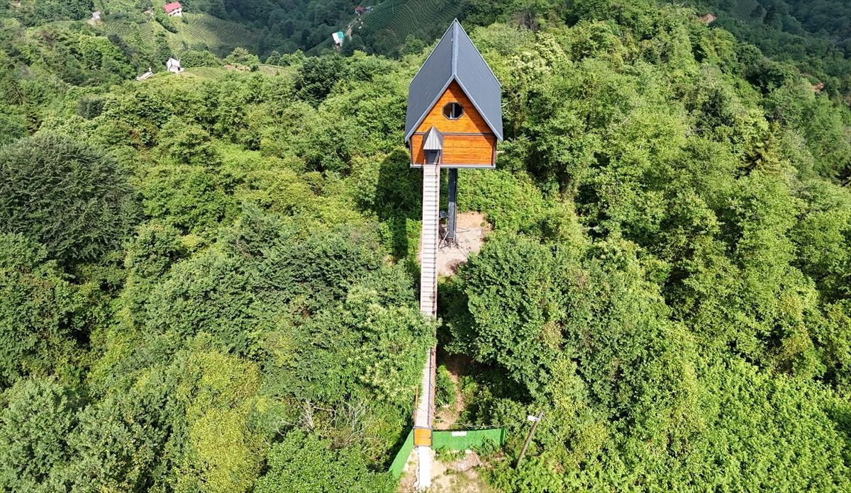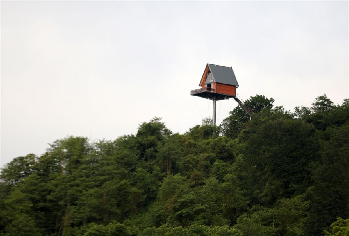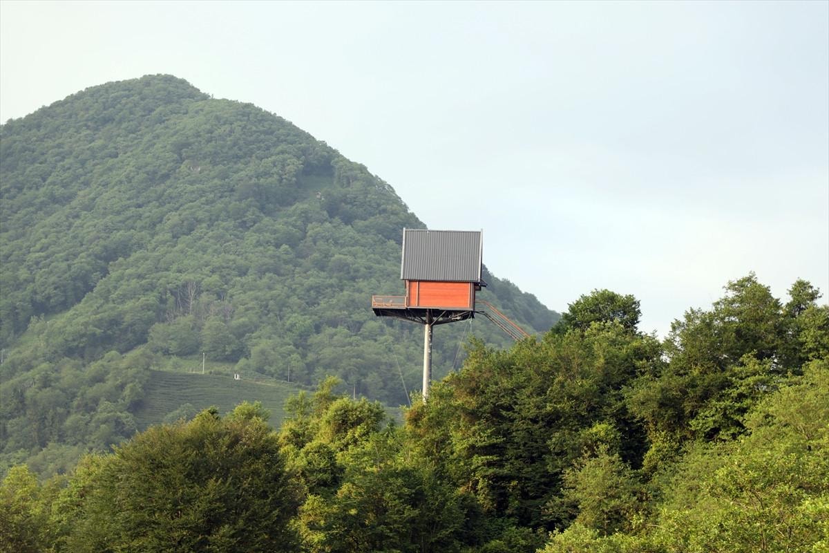 Oto kaporta ustası Rizeli Cihat Çelik, 6 yıllık çabası sonucunda 12 metrelik demir direk üzerine 70 metrekarelik 2 katlı ev kurdu.