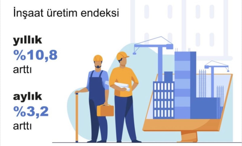 İnşaat üretim endeksi yıllık yüzde 10,8 ve aylık yüzde 3,2 artış gösterdi.