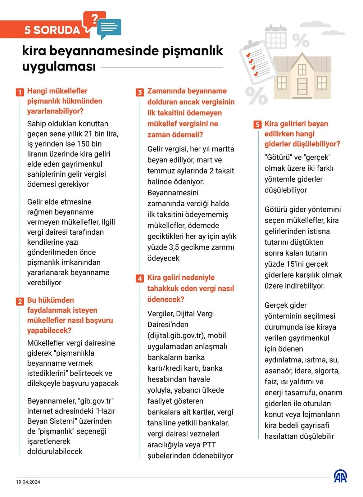 Sahip oldukları konuttan geçen sene yıllık 21 bin lira, iş yerinden ise 150 bin liranın üzerinde kira geliri elde eden gayrimenkul sahiplerinin gelir vergisi ödemesi gerekiyor. Gelir elde etmesine rağmen beyanname vermeyen mükellefler, ilgili vergi dairesi tarafından kendilerine yazı gönderilmeden önce pişmanlık imkanından yararlanarak beyanname verebiliyor. Pişmanlık hükmüyle beyanname verildiğinde, ceza uygulanmadan vergilerin ödenmesi imkanı bulunuyor.