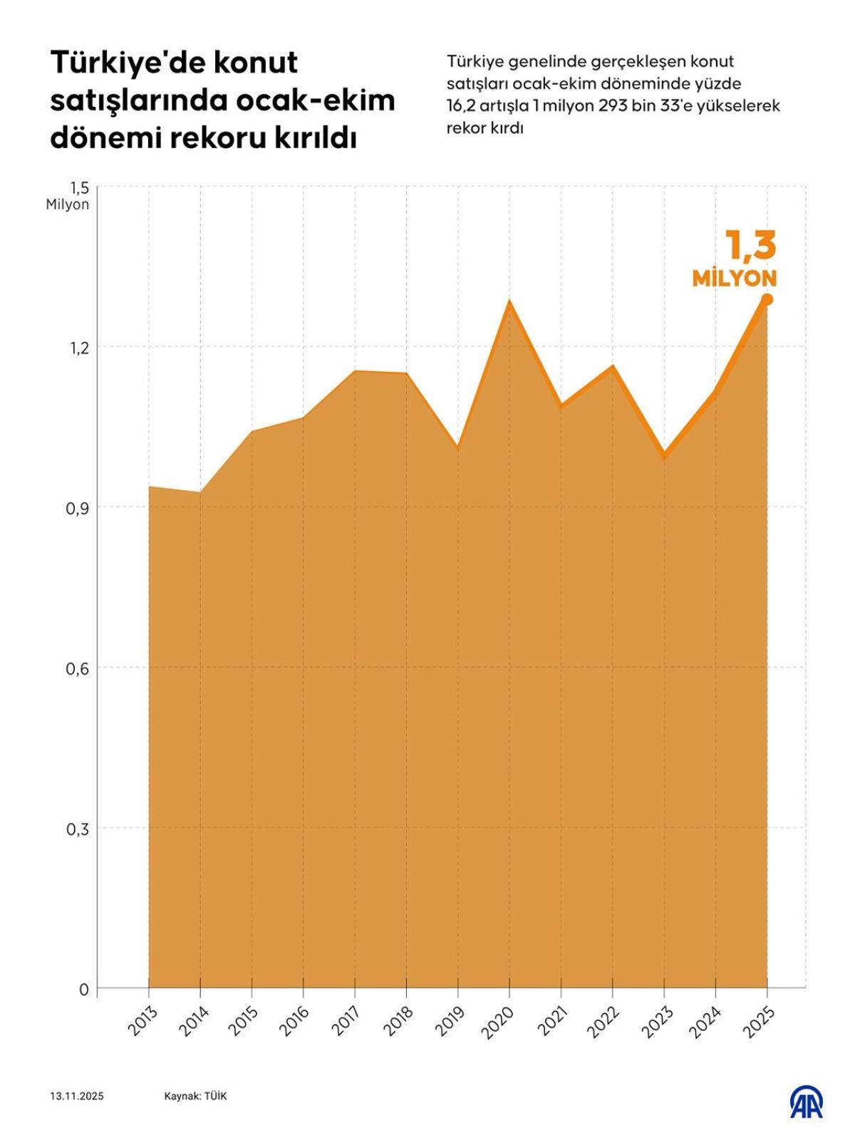 Konut satışları ocak-ekim döneminde yıllık bazda yüzde 16,2 artarak 1 milyon 293 bin 33'e yükseldi. Bu rakam tüm zamanların en yüksek ocak-ekim dönemi verisi olarak kayıtlara geçti. Bundan önceki en yüksek rakam 1 milyon 280 bin 852 adetle 2020 yılında görülmüştü.